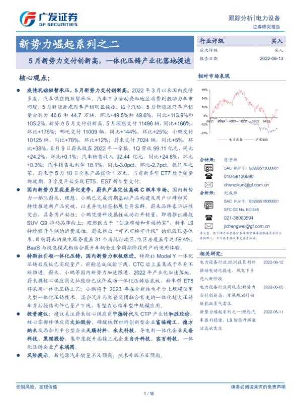 【广发证券】【20220613】电力设备新势力崛起系列之二:5月新势力交付创新高,一体化压铸产业化落地提速-16页