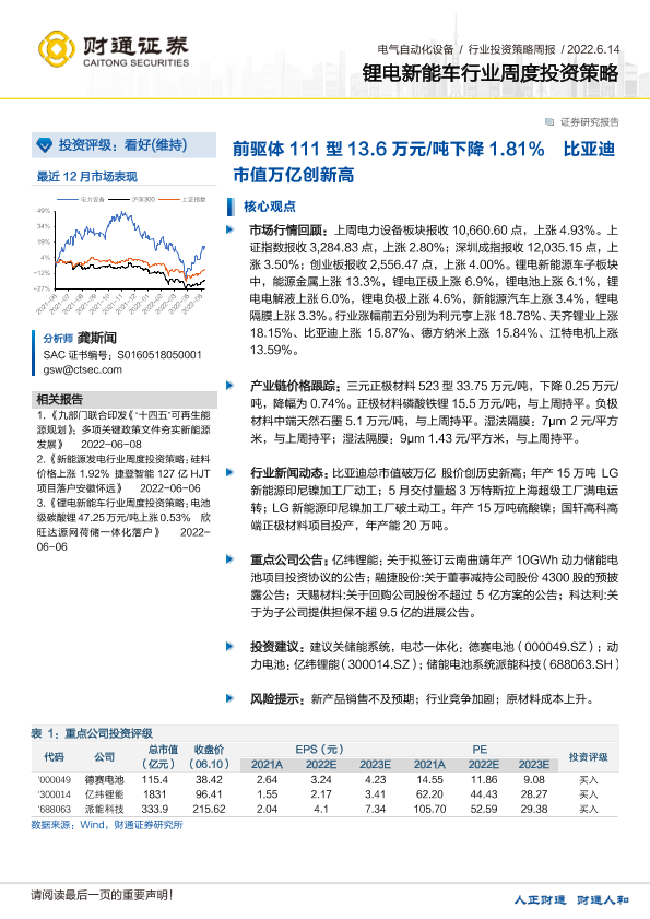 【财通证券】【20220614】锂电新能车行业周度投资策略:前驱体111型13.6万元/吨下降1.81%比亚迪市值万亿创新高-19页