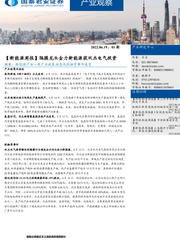 【国泰君安证券】【20220619】【新能源周报】隔膜龙头金力新能源获双杰电气投资-8页