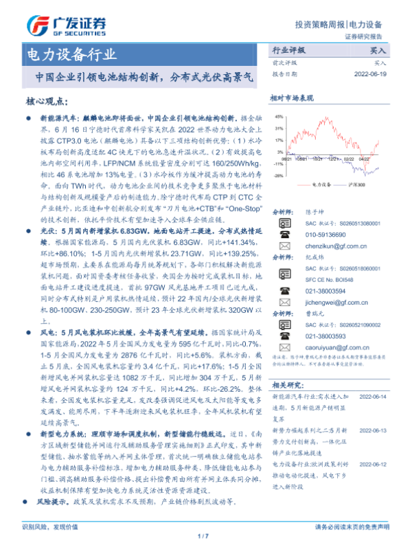 【广发证券】【20220619】20220619-广发证券-电力设备行业投资策略周报:中国企业引领电池结构创新,分布式光伏高景气-7页