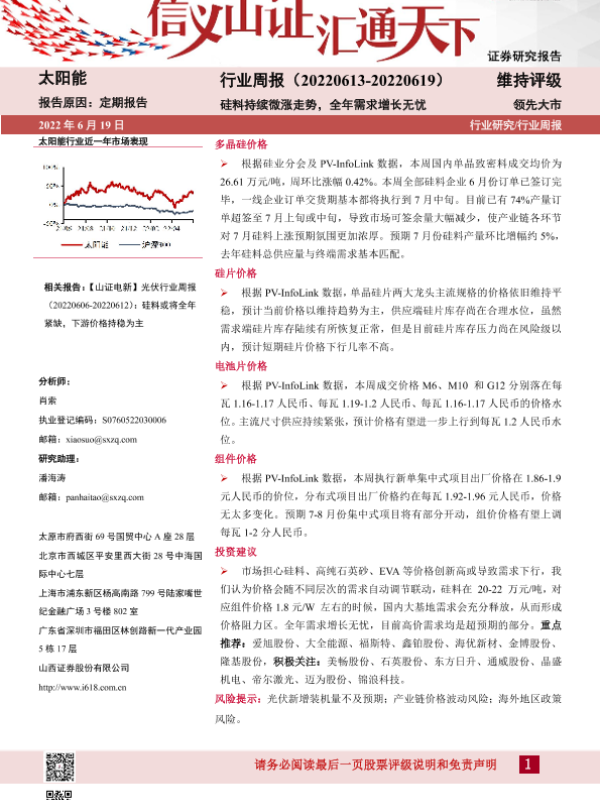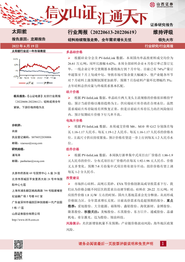 【山西证券】【20220619】20220619-山西证券-太阳能行业周报:硅料持续微涨走势,全年需求增长无忧-3页