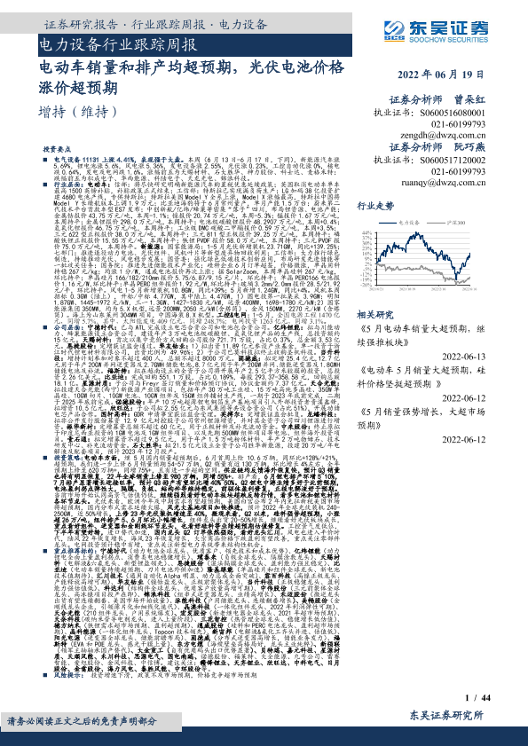 【东吴证券】【20220619】电力设备行业跟踪周报:电动车销量和排产均超预期,光伏电池价格涨价超预期-44页