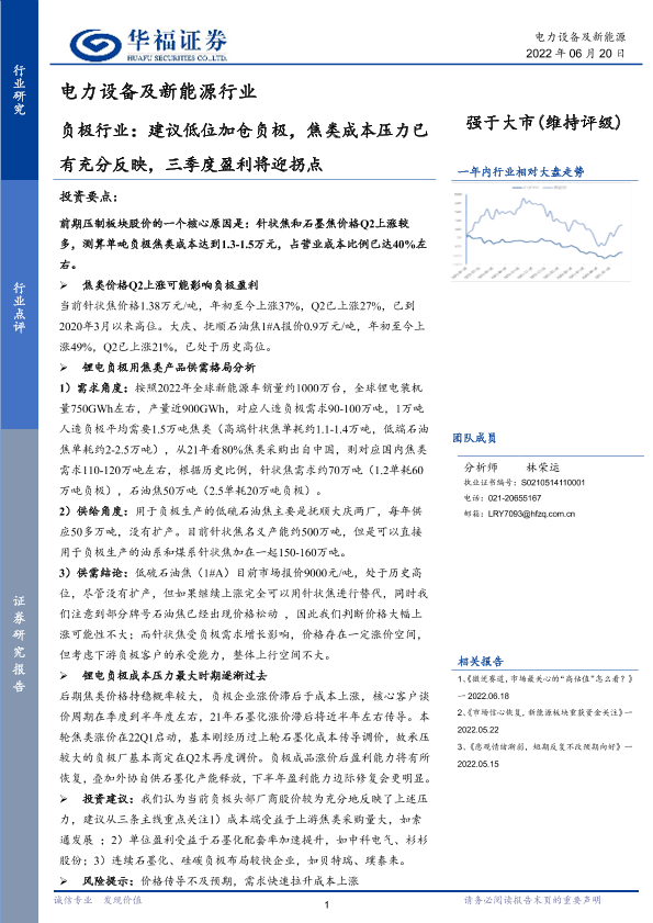 【华福证券】【20220620】电力设备及新能源行业:负极行业:建议低位加仓负极,焦类成本压力已有充分反映,三季度盈利将迎拐点-3页