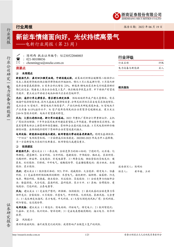 【浙商证券】【20220619】电新行业周报(第23周):新能车情绪面向好,光伏持续高景气-25页