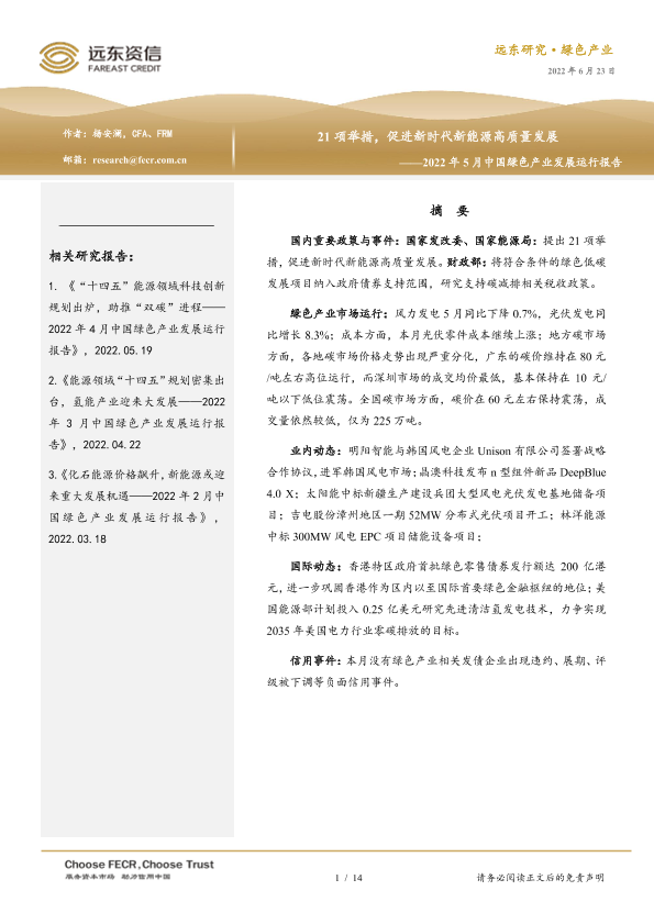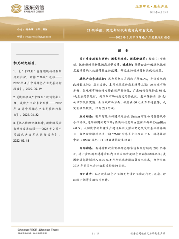 【远东资信】【20220623】21项举措,促进新时代新能源高质量发展——2022年5月中国绿色产业发展运行报告-14页