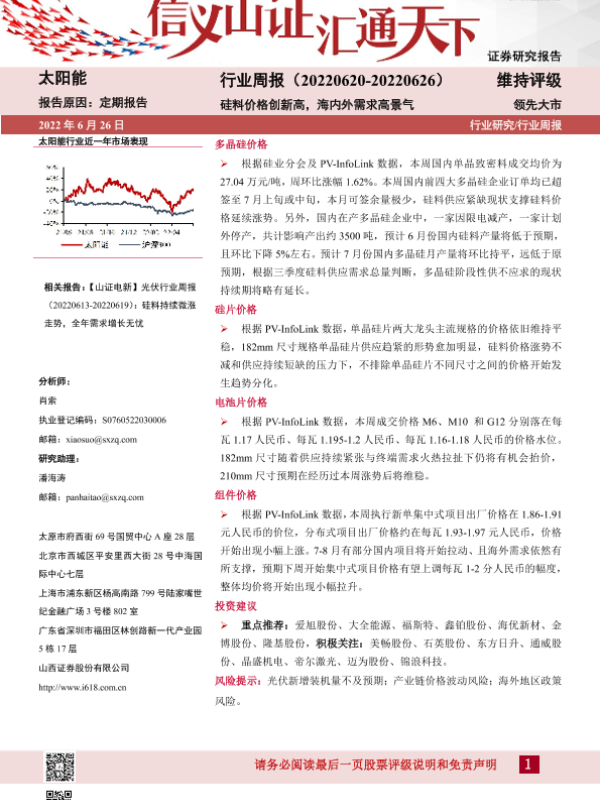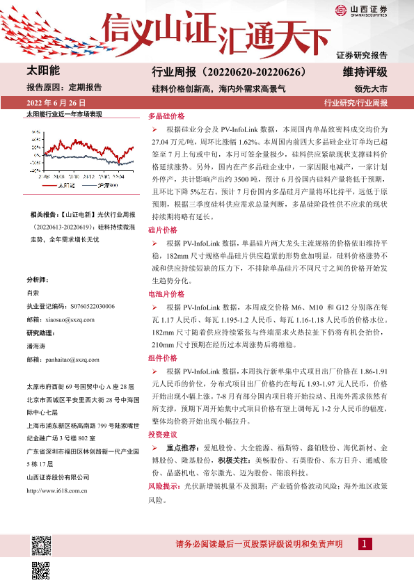 【山西证券】【20220626】太阳能行业周报:硅料价格创新高,海内外需求高景气-3页
