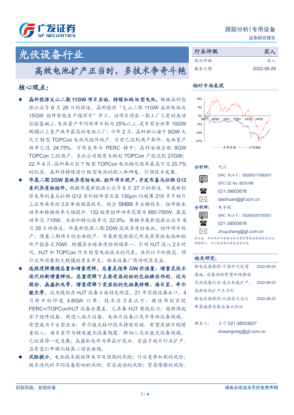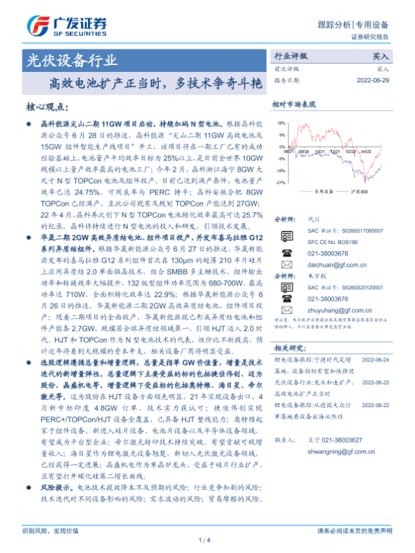 【广发证券】【20220629】光伏设备行业:高效电池扩产正当时,多技术争奇斗艳-4页