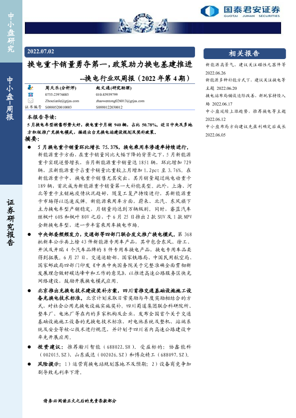【国泰君安证券】【20220702】换电重卡销量勇夺第一,政策助力换电基建推进-10页