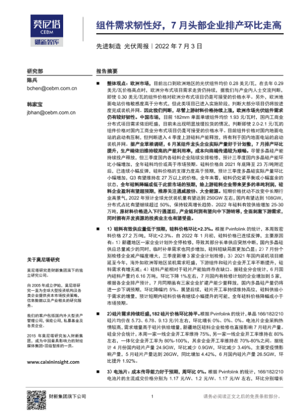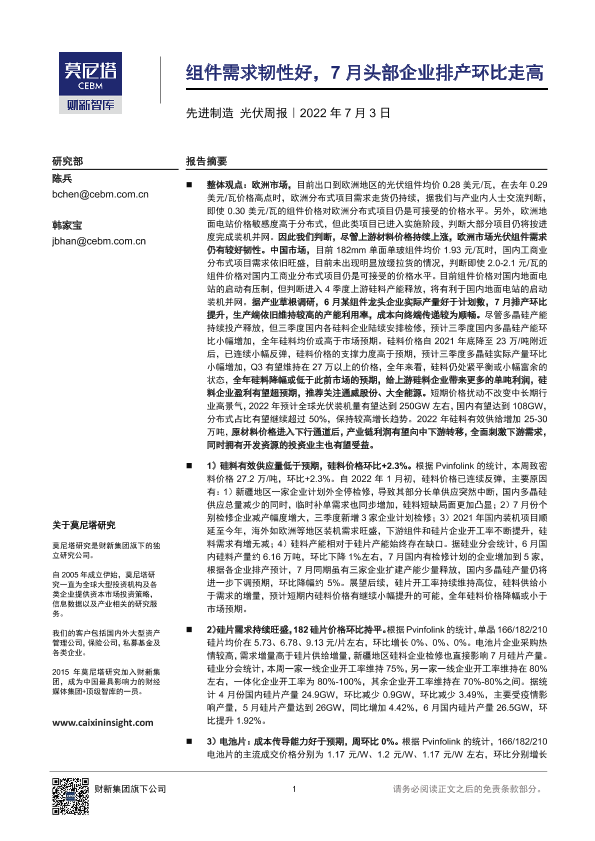 【莫尼塔研究】【20220703】先进制造光伏周报:组件需求韧性好,7月头部企业排产环比走高-16页