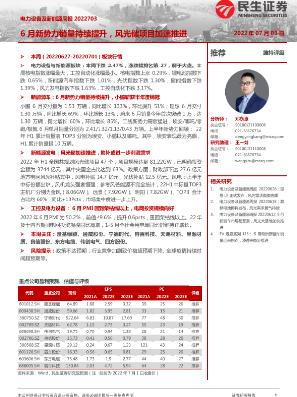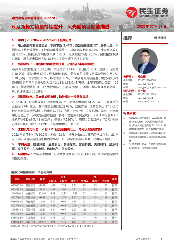 【民生证券】【20220703】电力设备及新能源周报:6月新势力销量持续提升,风光储项目加速推进-32页