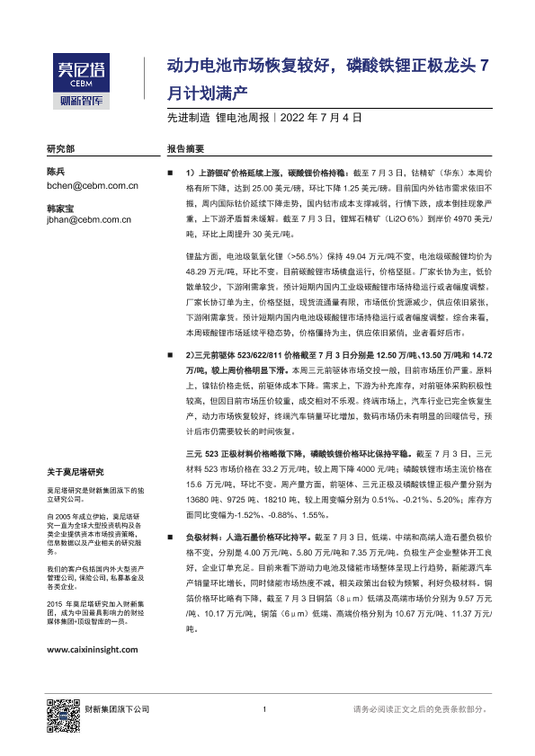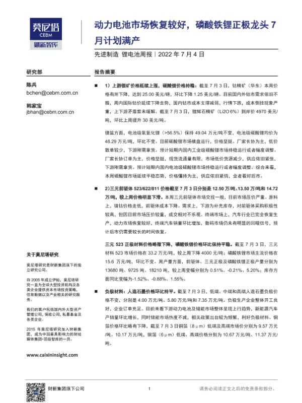 【莫尼塔研究】【20220704】20220704-莫尼塔投资-先进制造 锂电池周报:动力电池市场恢复较好,磷酸铁锂正极龙头7月计划满产-13页