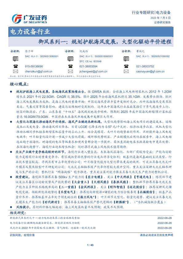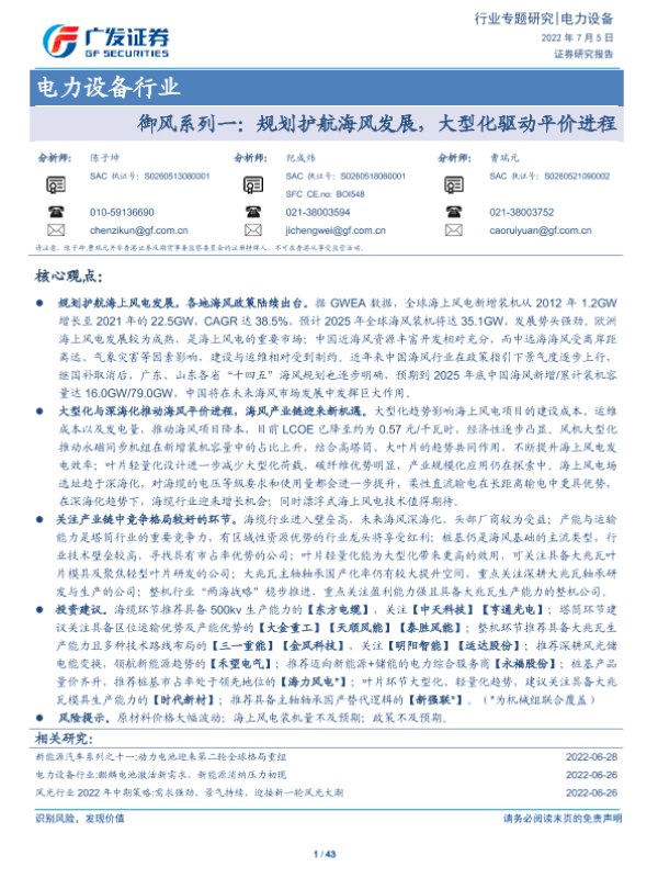 【广发证券】【20220705】电力设备行业:御风系列一:规划护航海风发展,大型化驱动平价进程-43页