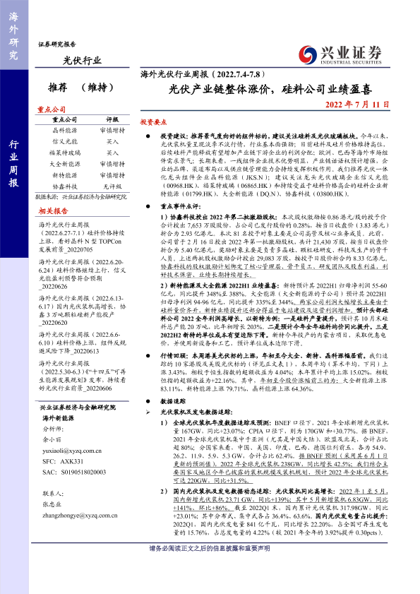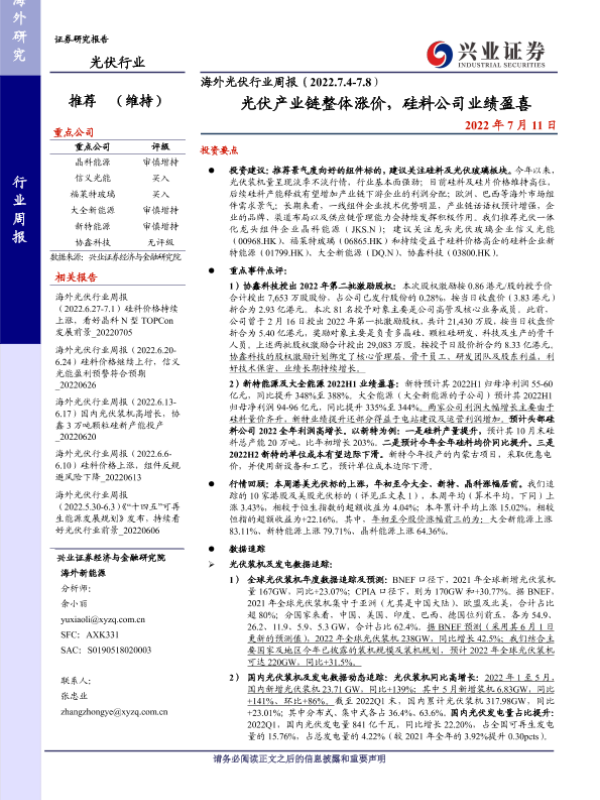【兴业证券】【20220711】海外光伏行业周报(2022.7.4-7.8)光伏产业链整体涨价,硅料公司业绩盈喜-21页