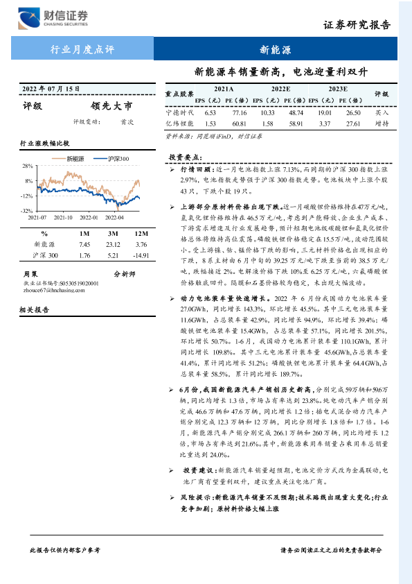 【财信证券】【20220715】新能源车销量新高,电池迎量利双升-13页