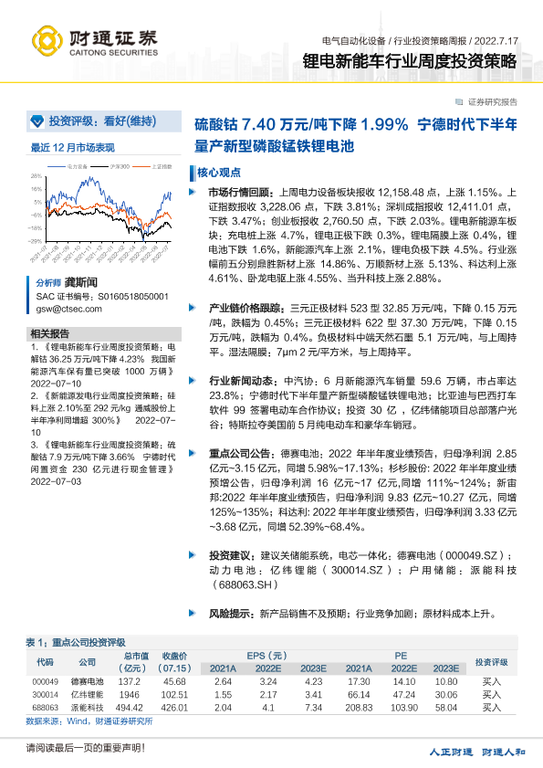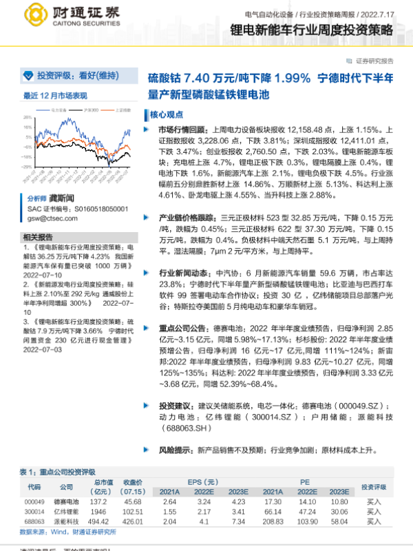 【财通证券】【20220717】锂电新能车行业周度投资策略:硫酸钴7.40万元/吨下降1.99% 宁德时代下半年量产新型磷酸锰铁锂电池-20页