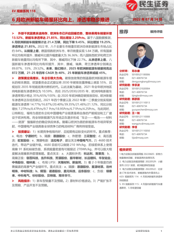 【民生证券】【20220716】EV观察系列 118 - 6月欧洲新能车销量环比向上,渗透率稳步推进-22页