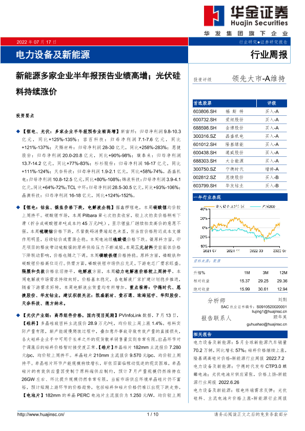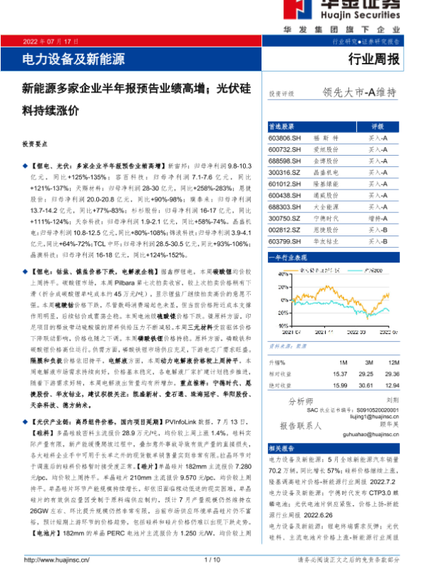 【华金证券】【20220717】电力设备及新能源行业周报:新能源多家企业半年报预告业绩高增;光伏硅料持续涨价-10页