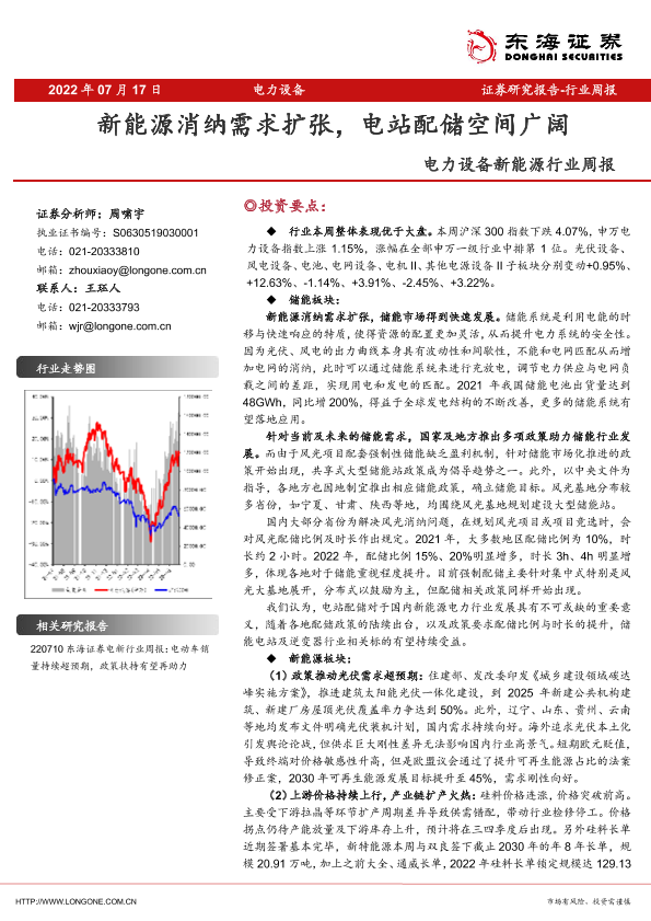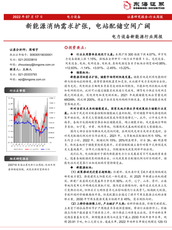 【东海证券】【20220717】电力设备新能源行业周报:新能源消纳需求扩张,电站配储空间广阔-32页