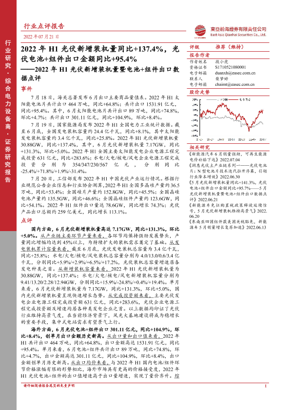 【东亚前海证券】【20220721】2022年H1光伏新增装机量暨电池+组件出口数据点评-4页