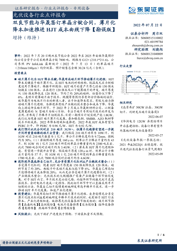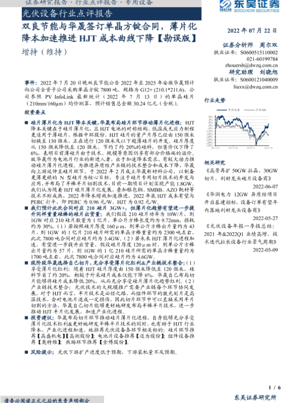 【东吴证券】【20220722】双良节能与华晟签订单晶方锭合同,薄片化降本加速推进HJT成本曲线下降-6页