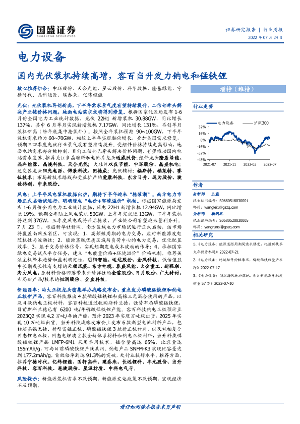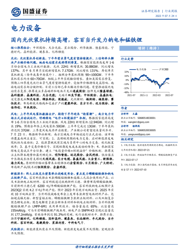 【国盛证券】【20220724】20220724-国盛证券-电力设备行业周报:国内光伏装机持续高增,容百当升发力钠电和锰铁锂-18页