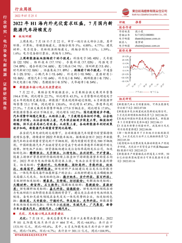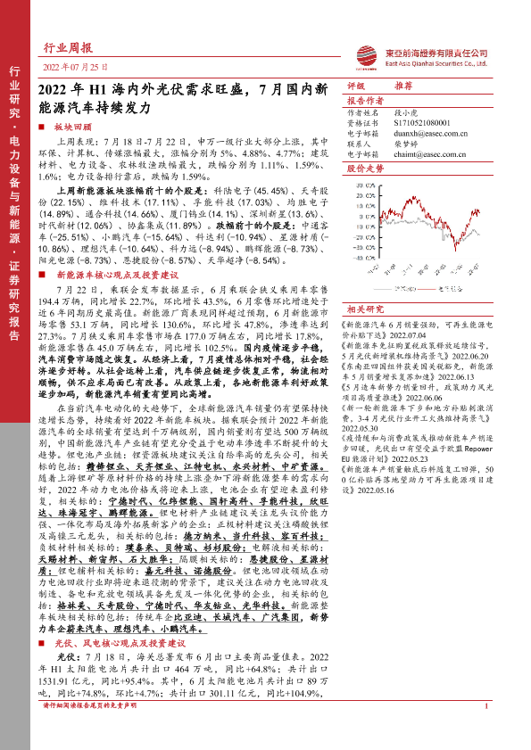 【东亚前海证券】【20220725】2022年H1海内外光伏需求旺盛,7月国内新能源汽车持续发力-27页