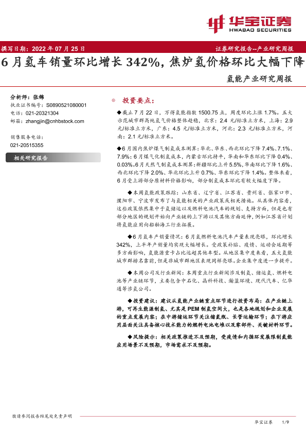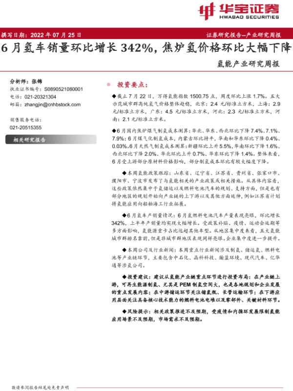 【华宝证券】【20220725】20220725-华宝证券-氢能产业研究周报:6月氢车销量环比增长342%,焦炉氢价格环比大幅下降-9页