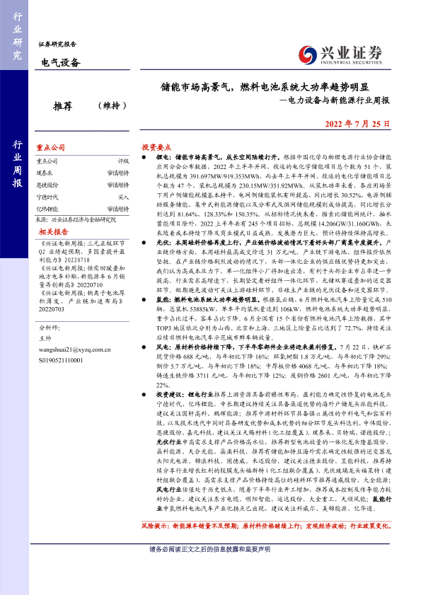【兴业证券】【20220725】储能市场高景气,燃料电池系统大功率趋势明显—电力设备与新能源行业周报-21页
