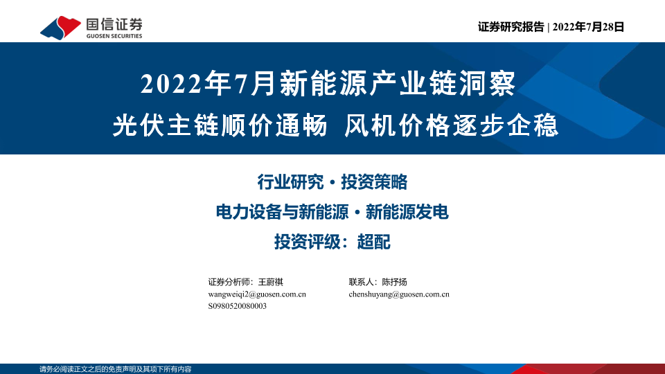 【国信证券】【20220728】2022年7月新能源产业链洞察:光伏主链顺价通畅 风机价格逐步企稳-38页