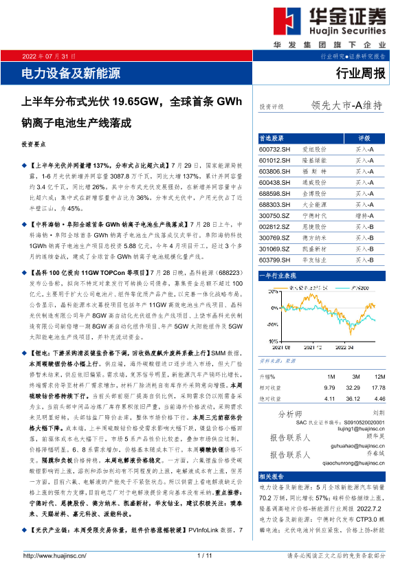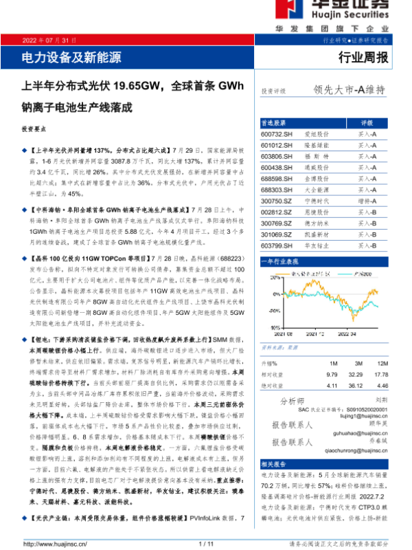 【华金证券】【20220731】20220731-华金证券-电力设备及新能源行业周报:上半年分布式光伏19.65GW,全球首条GWh钠离子电池生产线落成-11页