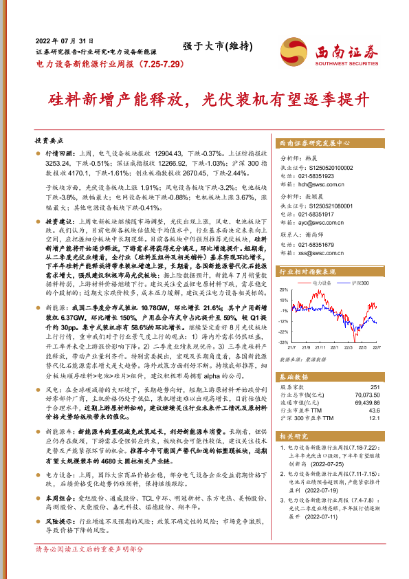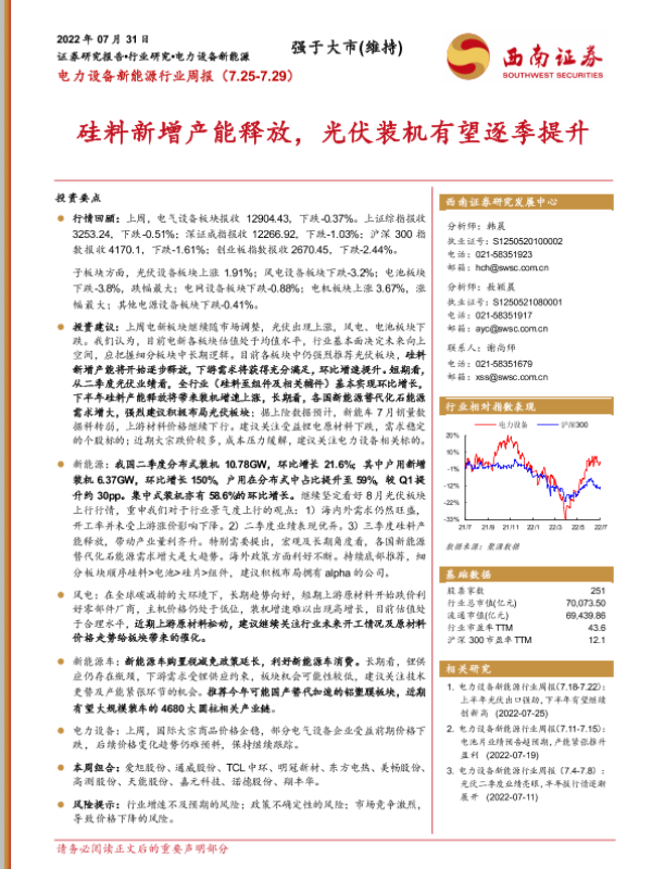 【西南证券】【20220731】电力设备新能源行业周报:硅料新增产能释放,光伏装机有望逐季提升-34页