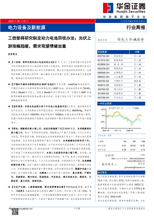 【华金证券】【20220807】电力设备及新能源:工信部将研究制定动力电池回收办法;光伏上游涨幅趋缓,需求观望情绪加重-10页
