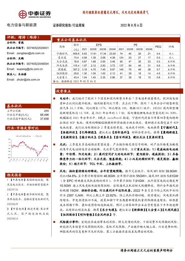 【中泰证券】【20220806】中泰证券-电力设备与新能源行业周报:国内储能装机量爆发式增长,风电光伏延续高景气-23页