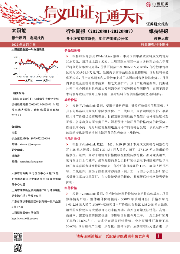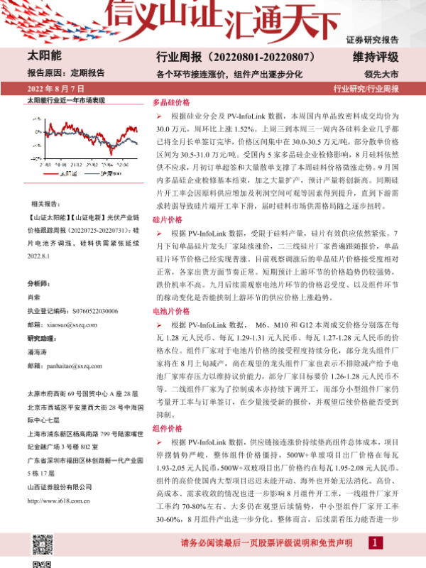 【山西证券】【20220807】20220807-山西证券-太阳能行业周报:各个环节接连涨价,组件产出逐步分化-4页