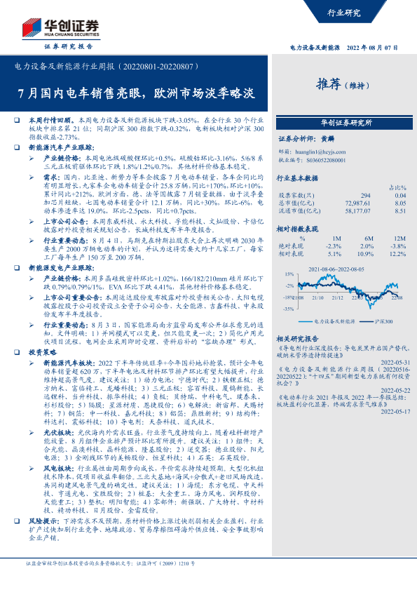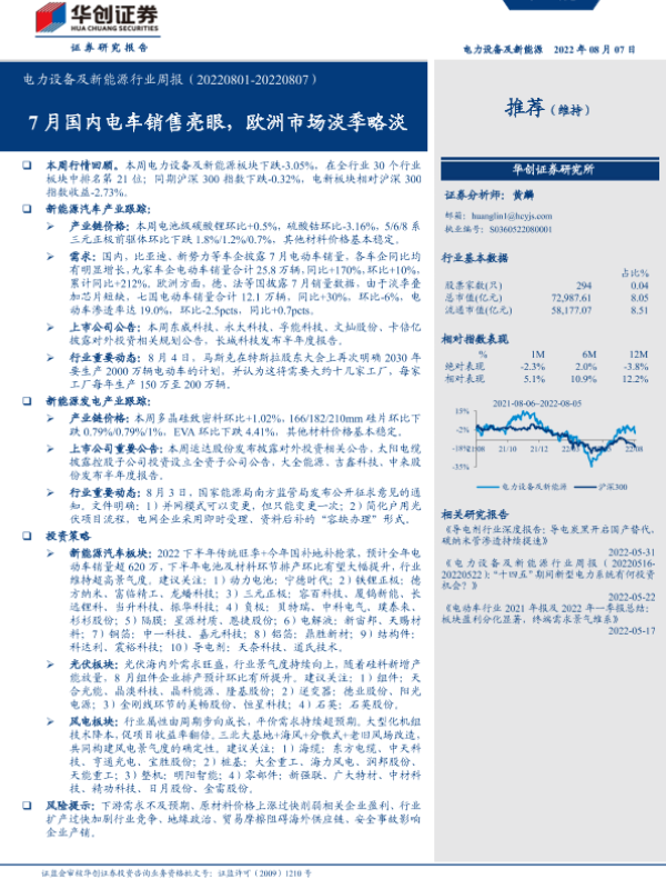 【华创证券】【20220807】电力设备及新能源行业周报:7月国内电车销售亮眼,欧洲市场淡季略淡-23页