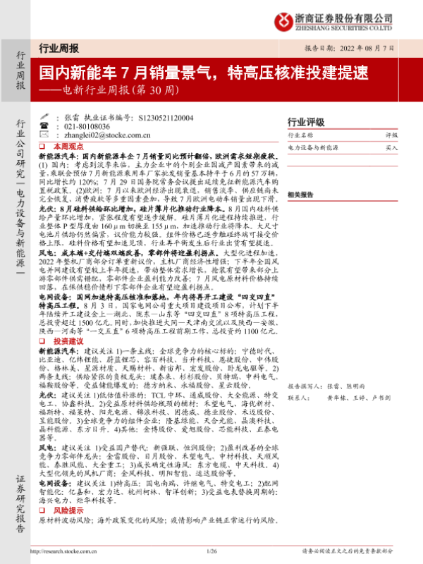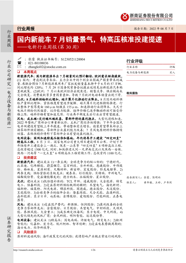 【浙商证券】【20220807】20220807-浙商证券-电新行业周报(第30周):国内新能车7月销量景气,特高压核准投建提速-26页