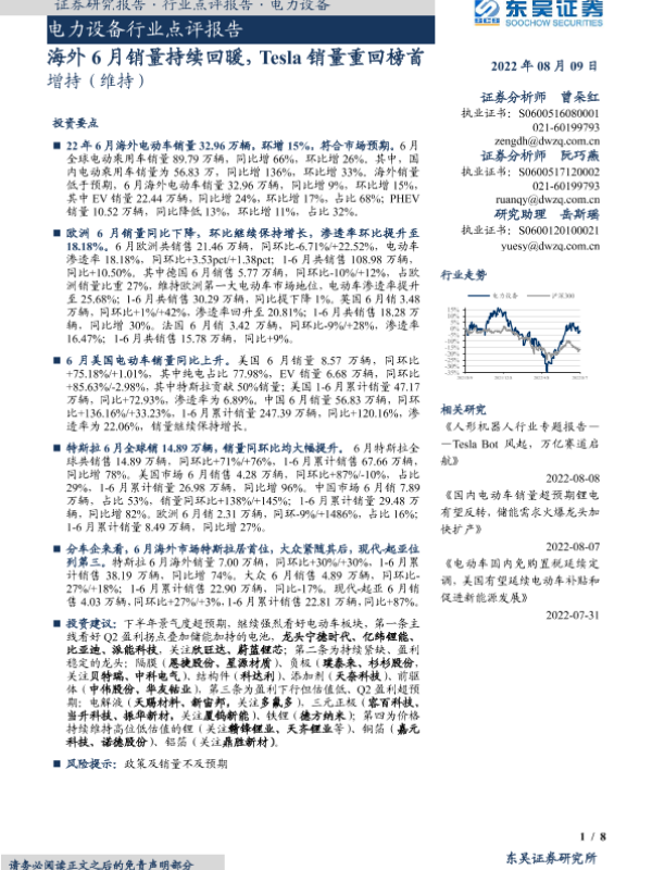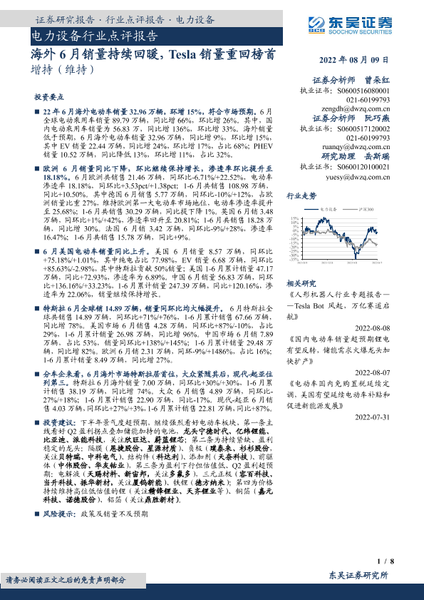 【东吴证券】【20220809】电力设备行业点评报告:海外6月销量持续回暖,Tesla销量重回榜首-8页