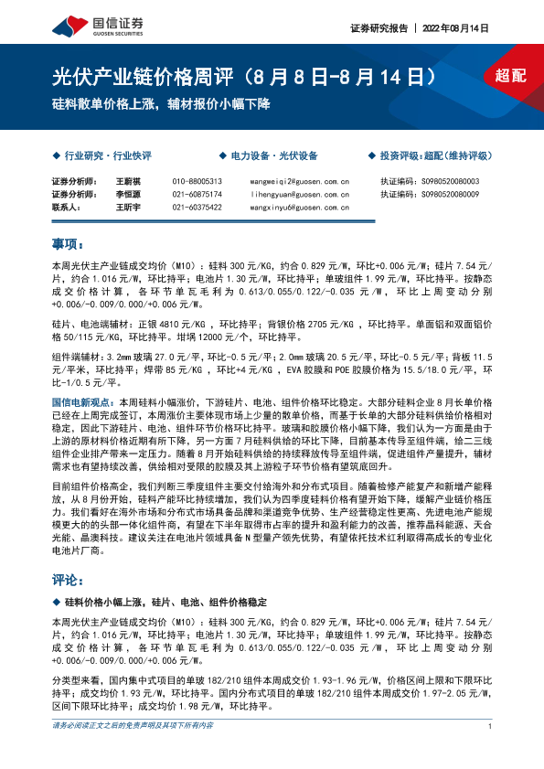 【国信证券】【20220814】光伏产业链价格周评:硅料散单价格上涨,辅材报价小幅下降-8页