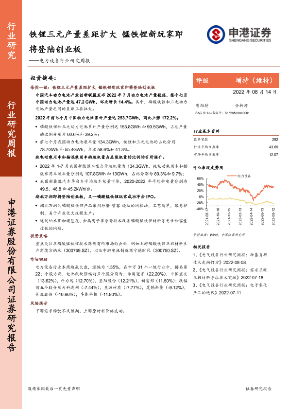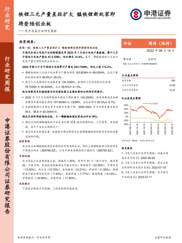 【申港证券】【20220814】电力设备行业研究周报:铁锂三元产量差距扩大 锰铁锂新玩家即将登陆创业板-8页