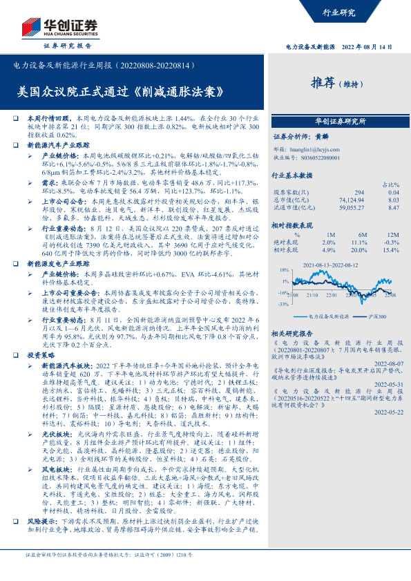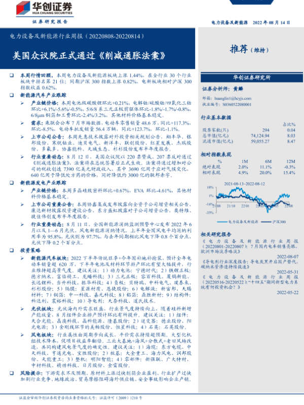 【华创证券】【20220814】电力设备及新能源行业周报:美国众议院正式通过《削减通胀法案》-22页