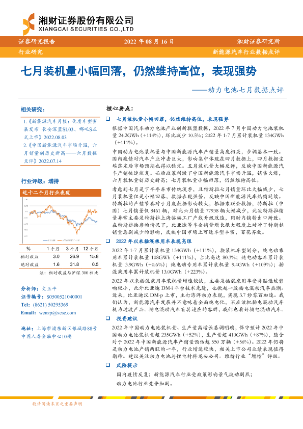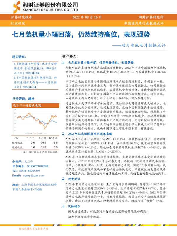 【湘财证券】【20220816】动力电池七月数据点评:七月装机量小幅回落,仍然维持高位,表现强势-10页