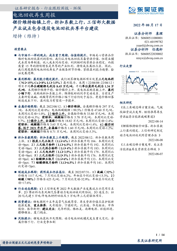 【东吴证券】【20220817】电池回收再生周报:锂价维持钴镍上升,折扣系数上行,工信部大数据产业试点包含退役电池回收共享平台建设-14页