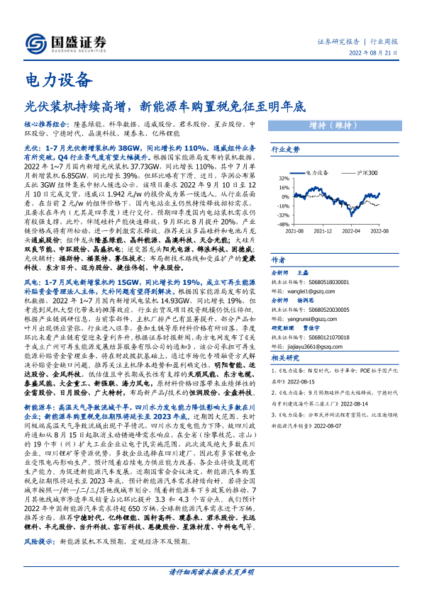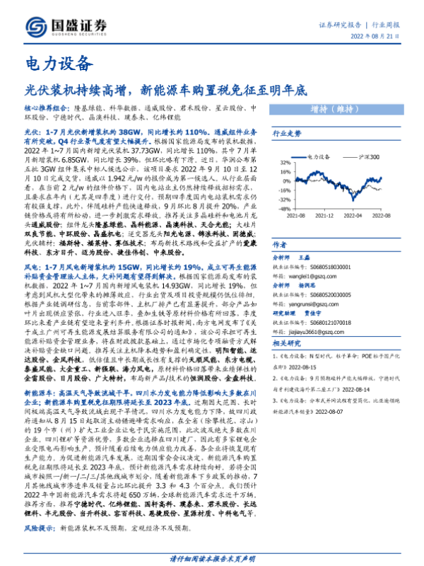 【国盛证券】【20220821】电力设备行业周报:光伏装机持续高增,新能源车购置税免征至明年底-16页