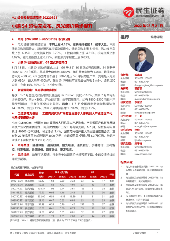 【民生证券】【20220821】电力设备及新能源周报:小鹏S4超快充发布,风光装机稳步提升-26页