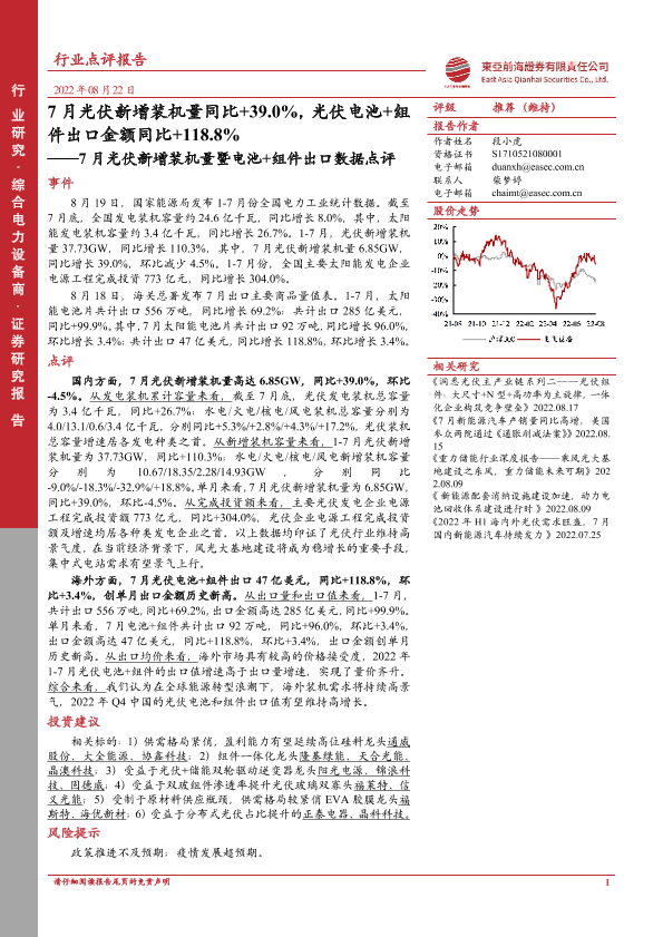 【东亚前海证券】【20220822】7月光伏新增装机量暨电池+组件出口数据点评-3页