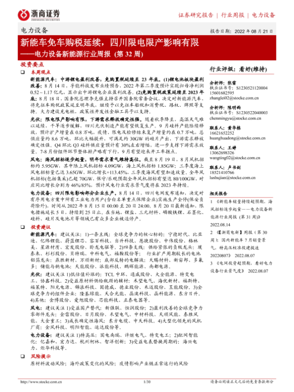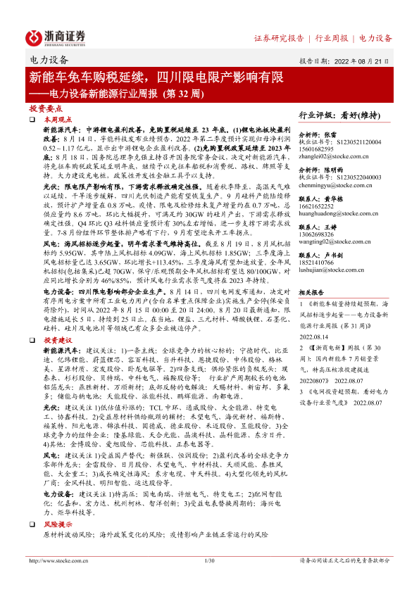【浙商证券】【20220821】20220821-浙商证券-电力设备新能源行业周报(第32周):新能车免车购税延续,四川限电限产影响有限-30页