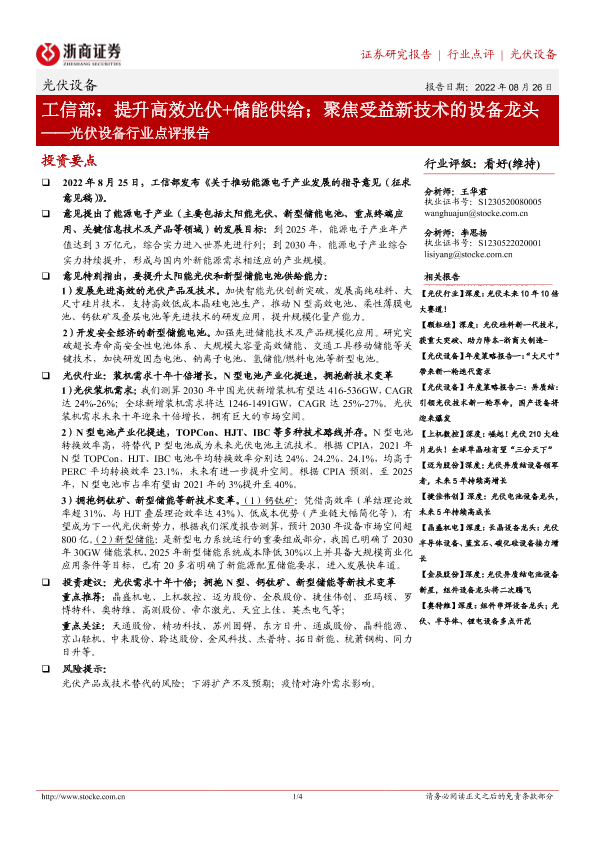 【浙商证券】【20220826】光伏设备行业点评报告:工信部:提升高效光伏+储能供给;聚焦受益新技术的设备龙头-4页