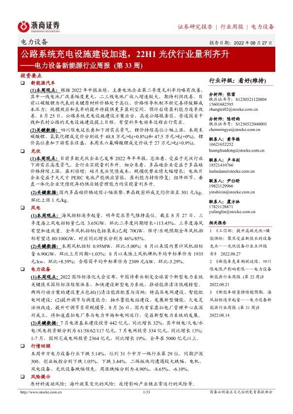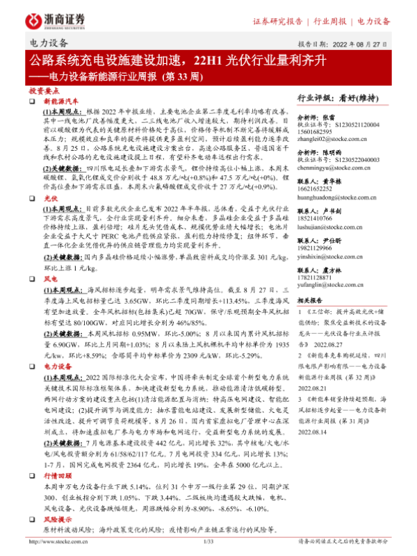 【浙商证券】【20220827】电力设备新能源行业周报(第33周):公路系统充电设施建设加速,22H1光伏行业量利齐升-33页
