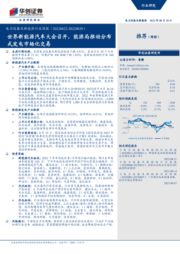 【华创证券】【20220828】电力设备及新能源行业周报:世界新能源汽车大会召开,能源局推动分布式发电市场化交易-25页