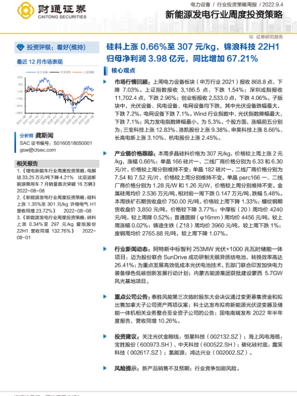 【财通证券】【20220904】20220904-财通证券-新能源发电行业周度投资策略:硅料上涨0.66%至307元 kg,锦浪科技22H1归母净利润3.98亿元,同比增加67.21%-26页